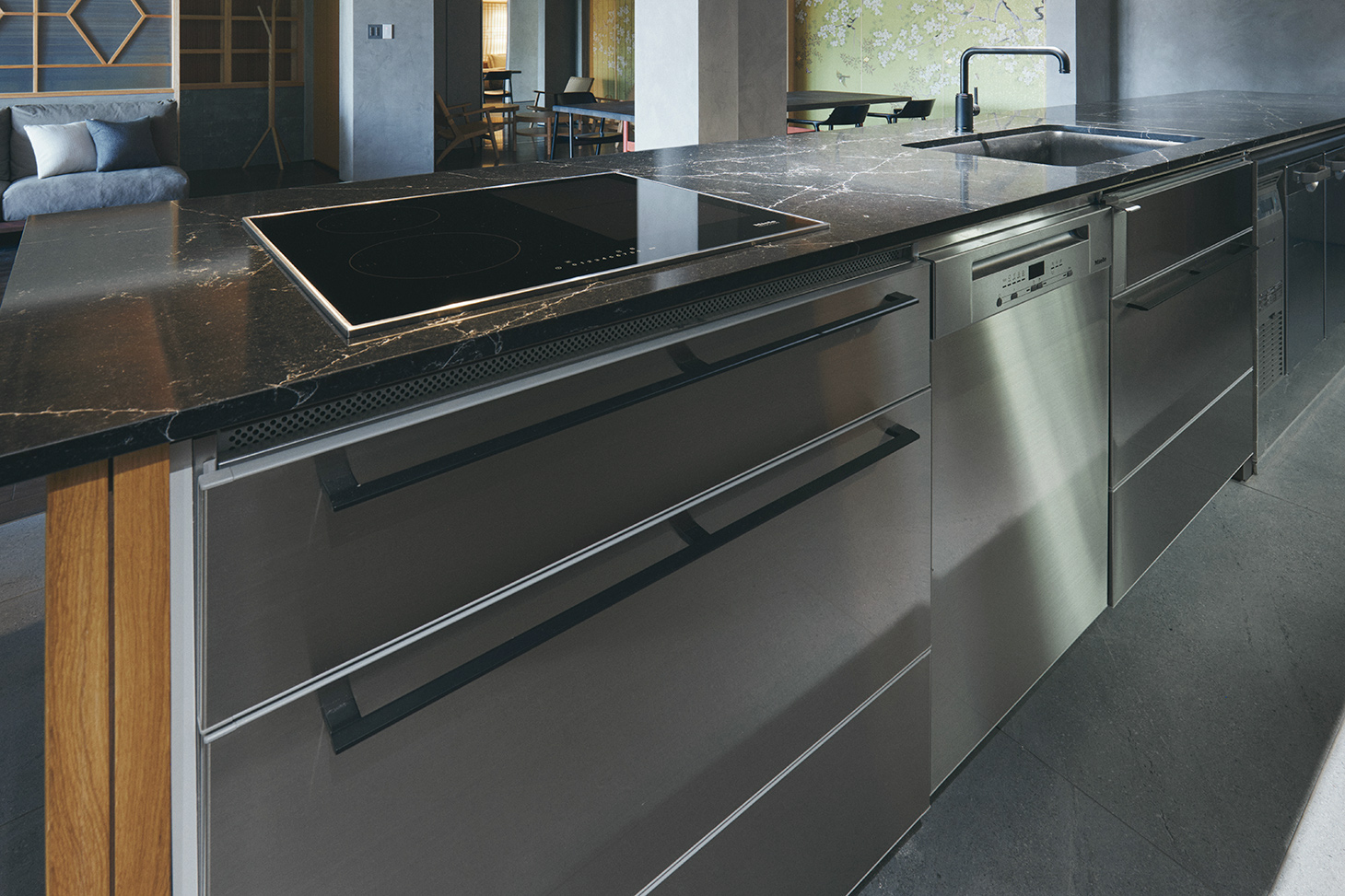 バーカウンターと一体になったアイランドキッチンは、調理と会話が自然に溶け合うオープンな設計。ダイニングやリビングとゆるやかにつながる構造で、空間全体を見渡せるため、小さなお子様連れのご家族にも安心。料理を楽しむにも、シェフを招いて過ごすにも最適です。