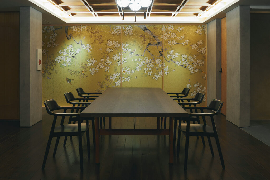 天然染料で染められたやわらかな風合いのテーブルは、6名がゆったりと座れる広さを確保。テーブルの背景には金屏風のような装飾のふすまが静かに輝き、日本の伝統技法である格子天井と調和します。和の意匠と落ち着いた照明が織りなすダイニングで、記憶に刻まれる食事体験を。